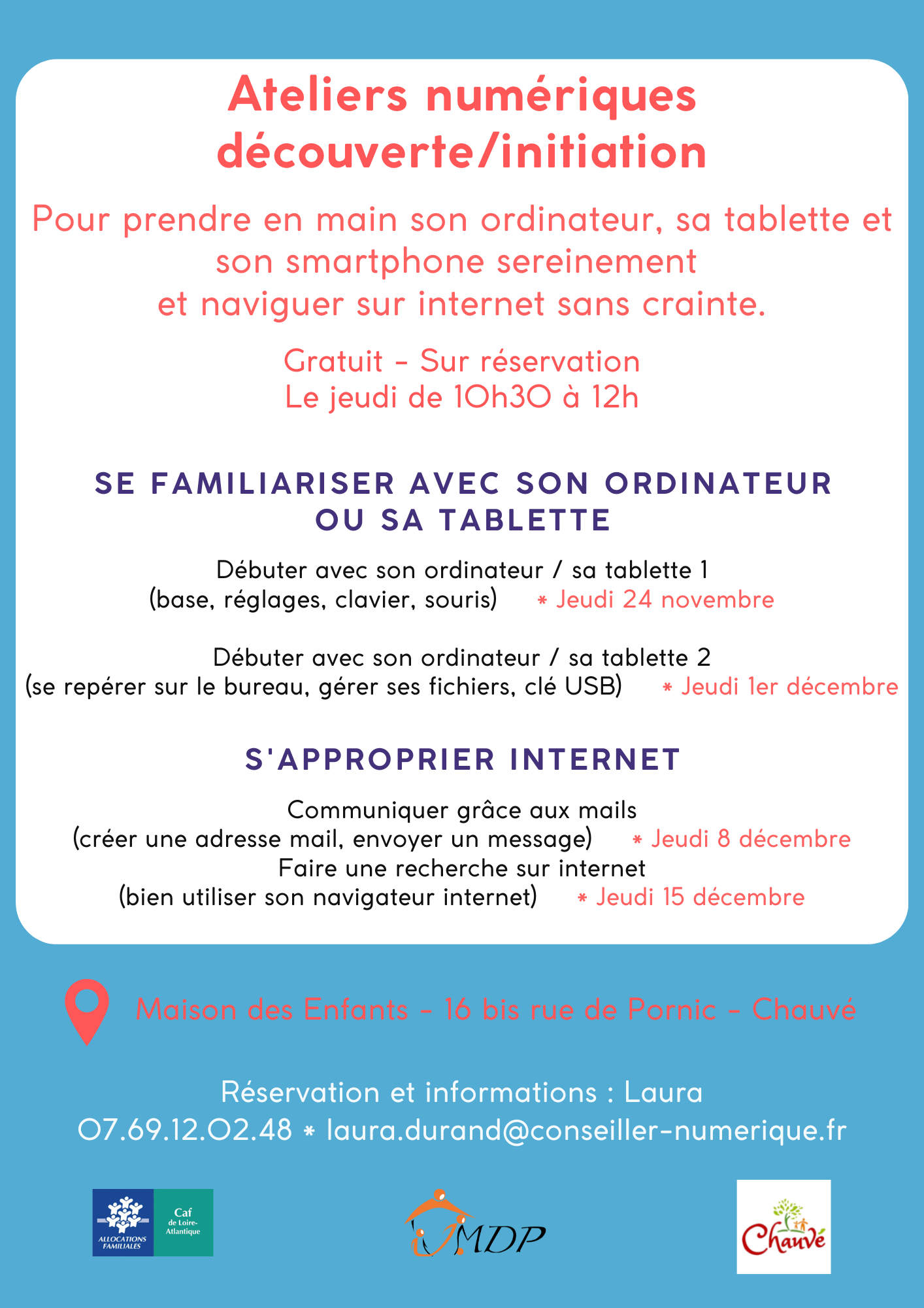 Laura DURAND, conseillère numérique, vous propose quatre ateliers d’initiation afin de prendre en main vos différents outils numériques (ordinateurs, tablettes, smartphones, …).