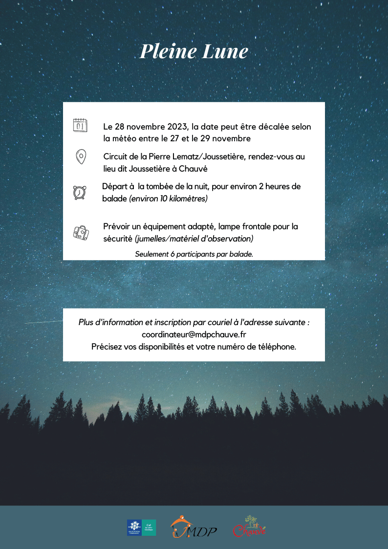 Des balades seront proposées lors des pleines lunes suivantes : 28/11/2023 – 24/04/2024 – 23/05/2024 – 21/06/2024 – 23/07/2024