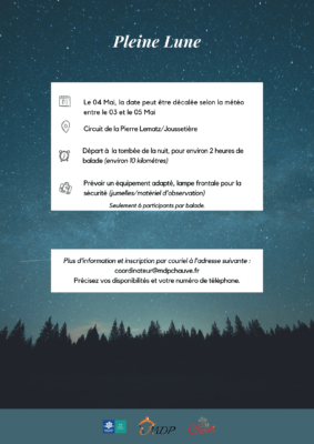 La nuit, à la lueur de la lune, se balader dans les chemins communaux. Jérémie, habitant de la commune passionné de randonnée et de nature, vous emmène découvrir la faune et la flore locale, d’un œil nouveau. La nuit, nos sens perçoivent l’environnement d’une toute autre manière. Aussi, certains animaux sortent de leurs cachettes…