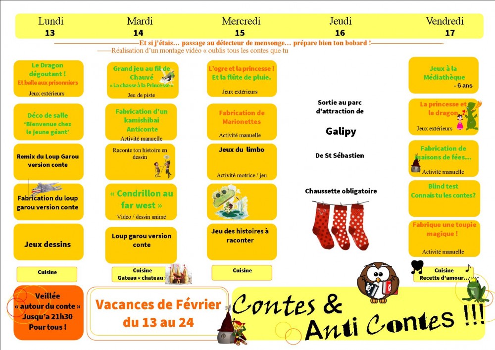 N’oubliez pas que les vacances commencent le lundi 13 février avec une veillée (jusqu’à 21h30) ! Repas et voyage à travers les contes seront au rendez-vous de cette soirée… Inscrivez-vous !