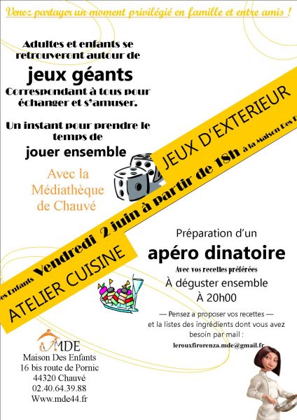 Rendez vous à la Maison Des Enfants à partir de 18h00. La formule est simple : soit vous souhaitez cuisiner et dans ce cas nous vous invitons à nous transmettre vos recettes, soit vous venez uniquement jouer ou alors vous pouvez faire les deux !