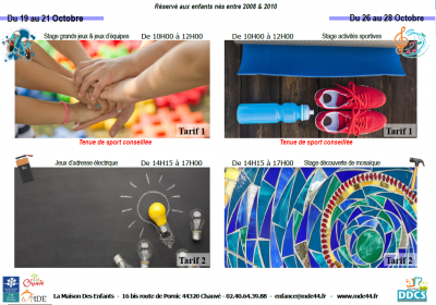 Le programme de ces vacances est encore en cours d’élaboration par l’équipe d’animation. Comme d’habitude, dès qu’il sera validé et mis en forme, nous vous le communiquerons et il sera disponible sur notre site internet et dans nos locaux.