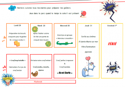 Un programme de vacances à croquer de bout en bout. Des sorties, de la fabrication, des goûters faits maison et tout un tas d’activités pour passer des vacances amusantes et enrichissantes.