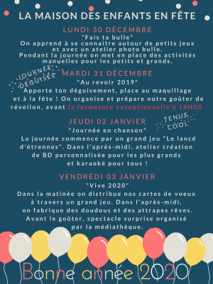 Un programme de vacances aussi festif que les traditionnelles fêtes de fin d’année le veulent. Des activités pour décoller de 2019 et atterrir en 2020 dans la bonne humeur.