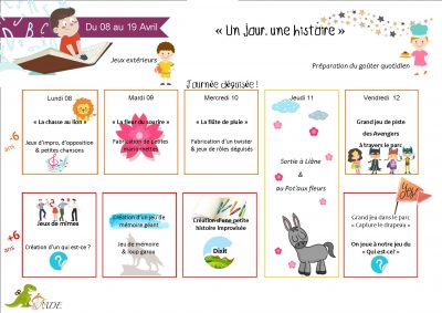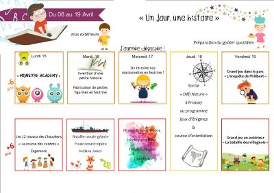 Chaque jour, une nouvelle histoire à raconter et se raconter. Surtout, des mercredis déguisés, des sorties, des goûters faits maison et tout un tas d’activités pour passer des vacances aussi belles que le printemps qui s’annonce.