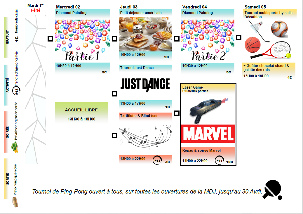 - Matinée agencement MDJ : Objectifs divers : Finir te monter les portes du placard, installer le PC dédié aux ados, faire un coup de rangement, … Vous pouvez venir nous prêter main forte ou venir en accueil libre à la MDJ ;
