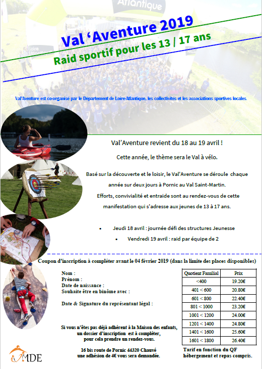 La Maison des jeunes propose d’accompagner quatre équipes de deux jeunes sur le Val’Aventure 2019 le jeudi 18 avril et le vendredi 19 Avril prochain.