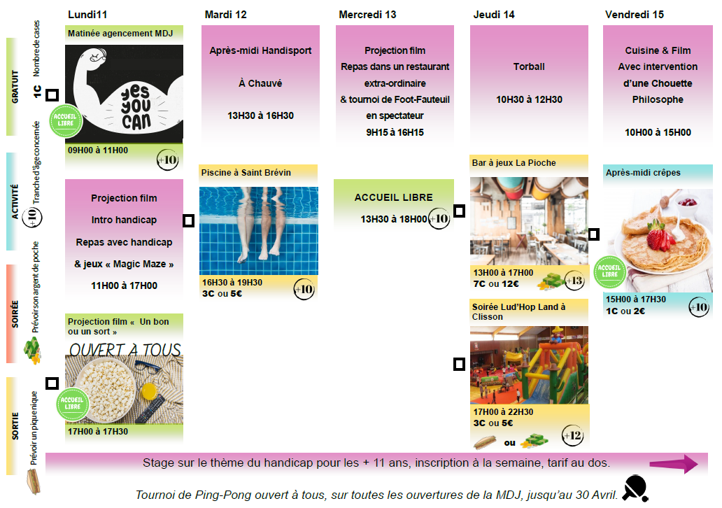En plus de notre programmation « classique » (Soirée Lud’Hop Land à Clisson, Piscine de St Brévin, Crêpes, Bar à jeux à Nantes pour les plus de 13 ans, accueils libres, …) nous vous proposons un lot d’animations en lien avec le/les handicap(s). Du sport, des films, des repas et des débats.