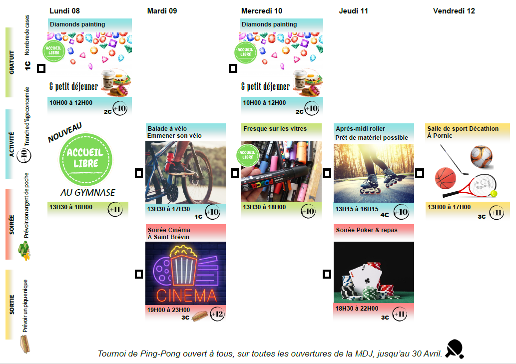 - Accueil libre au gymnase : Ça va devenir une habitude sur les semaines de vacances. Le lundi après-midi, de 14h à 18h, nous emmènerons tout notre matériel de sport au complexe du Pinier et vous aurez accès librement au gymnase et aux terrains de tennis. Pour cette fois-ci, nous vous invitons à prendre vos rollers ;