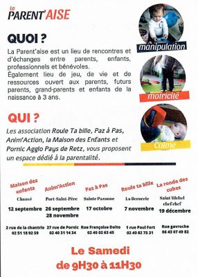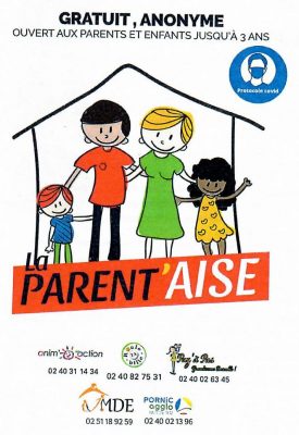 La Parent’Aise, c’est un lieu de rencontre et d’échanges entre parents, enfants, professionnels et bénévoles. Également lieu de jeu, de vie et de ressources ouvert aux parents, futurs parents, grands-parents et enfants de la naissance à 3 ans. L’accueil sur ces lieux est gratuit et anonyme, La Parent’Aise se déplace sur différentes structures du Pays-de-Retz.