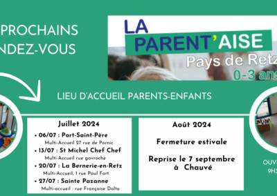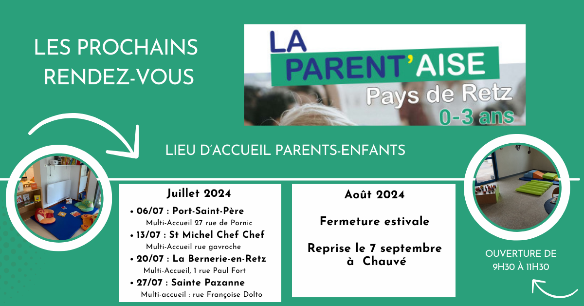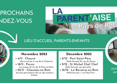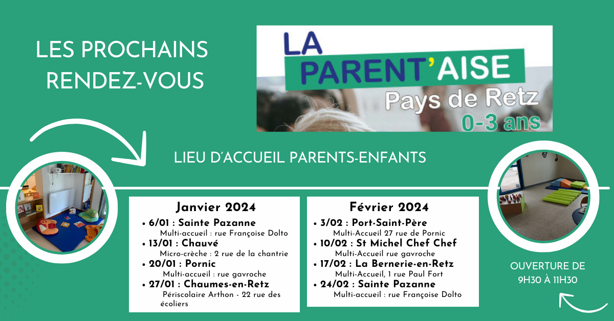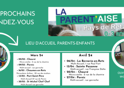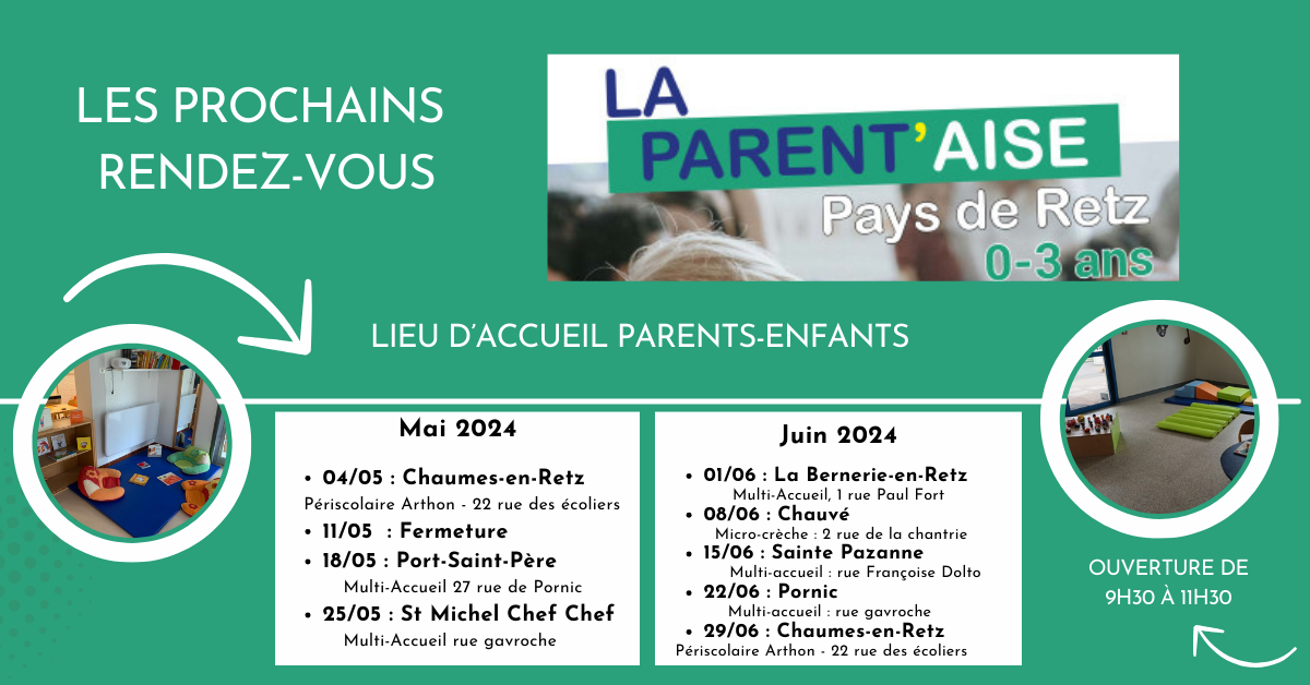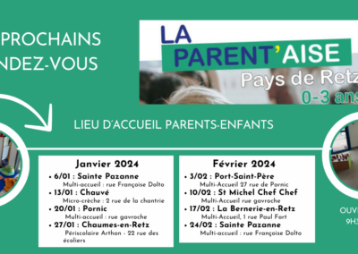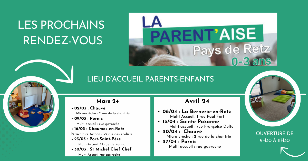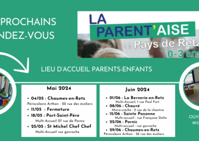 LA PARENT’AISE vous accueille tous les samedis de 9h30 à 11h30 en itinérance sur le Pays de Retz. Retrouvez toutes les informations sur www.pornicagglo.fr.