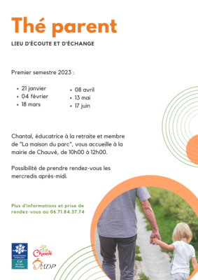 À l’initiative de Chantal, habitante de la commune et dans le cadre de l’Espace de Vie Sociale, la maison du parc met en place un lieu d’écoute et d’échange autour de la parentalité, Thé parent.
